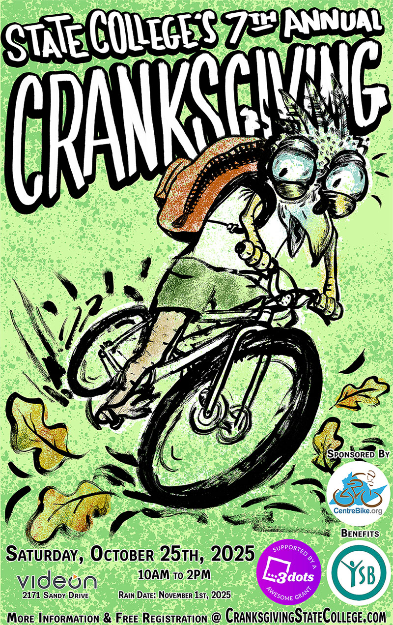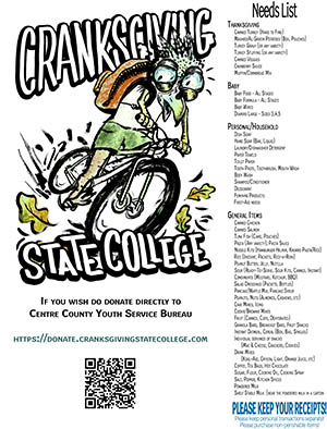 Cranksgiving State College is back for its 7th year! This annual event brings together our local cycling community to collect food and essentials for the Centre County Youth Service Bureau.